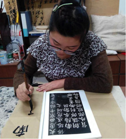 最受期待的就是实践环节了,参与体验的同学水平不等,卢忠敏博士具有书法研习经验,已经掌握了运笔等技巧,书法作品水平相对较高。袁菁鸿等同学没有专门学习过书法,只是在学校开设的课程中练习过,面对这样水平的同学,蔡思超学姐让她们先学习运笔,从点、线条开始练起。期间,同学们挑选了喜欢的字帖进行了临摹,主讲人对于同学们的作品进行了点评和分析,并为其精进提供了建议。蔡思超学姐强调,练习书法是一个需要长期坚持的过程,在笔墨交融的时候,纸笔接触的刹那,屏气凝神,将全身心都投入进去,会有难得的审美观照,这种体验是非常美好的,不常遇、难强求、需珍惜。