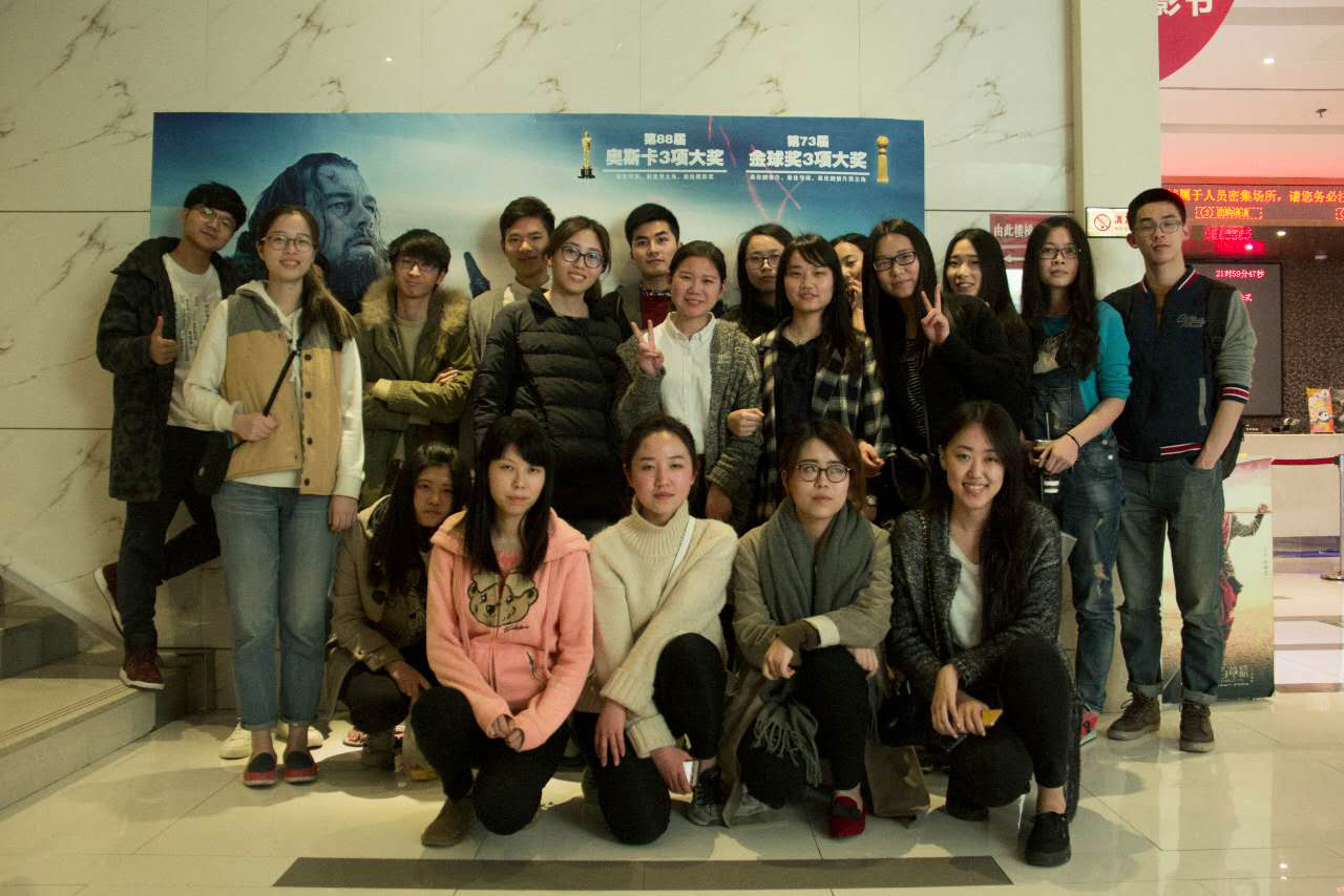 本次活动方式轻松愉快,因此立马获得了班级同学的认可。随后,便由班委开始负责联系与订票等工作。本班的班委负责制,由数个班委固定负责六七个班级同学日常的通知统计等工作,从班级成立之时开始实施,已经发挥出了巨大的作用,本次活动也因此能够开展得有条不紊。18日晚7点左右,同学们陆续结伴到达离校区不远的光影影院,在电影票发放完毕后,大家进入影院开始观看《荒野猎人》。