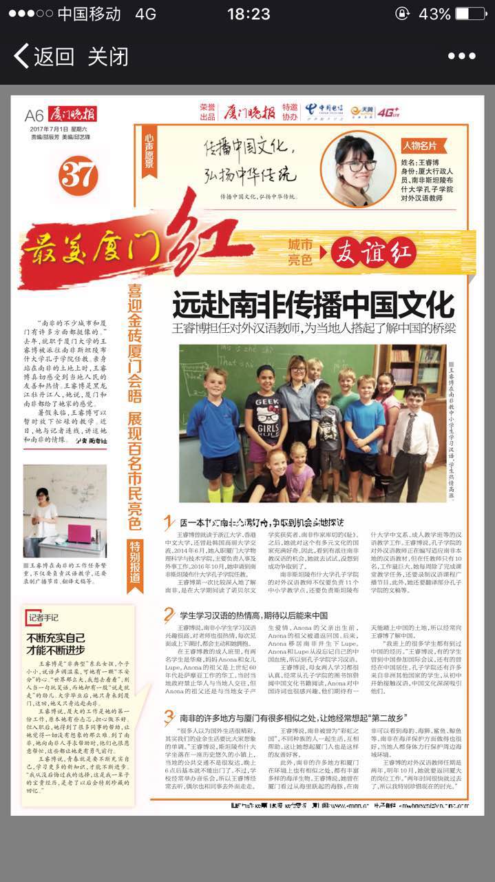 7月1日《厦门晚报》A6版整版对传媒学院对外汉语专业2013届毕业生王睿博同学进行了报道。王睿博为传媒学院2008级对外汉语专业本科生,曾在韩国高丽大学交流,于2013年毕业。毕业后,王睿博同学在香港中文大学学习,获应用语言学硕士学位,之后入职厦门大学物理科学与技术学院,主要负责人事及外事工作。