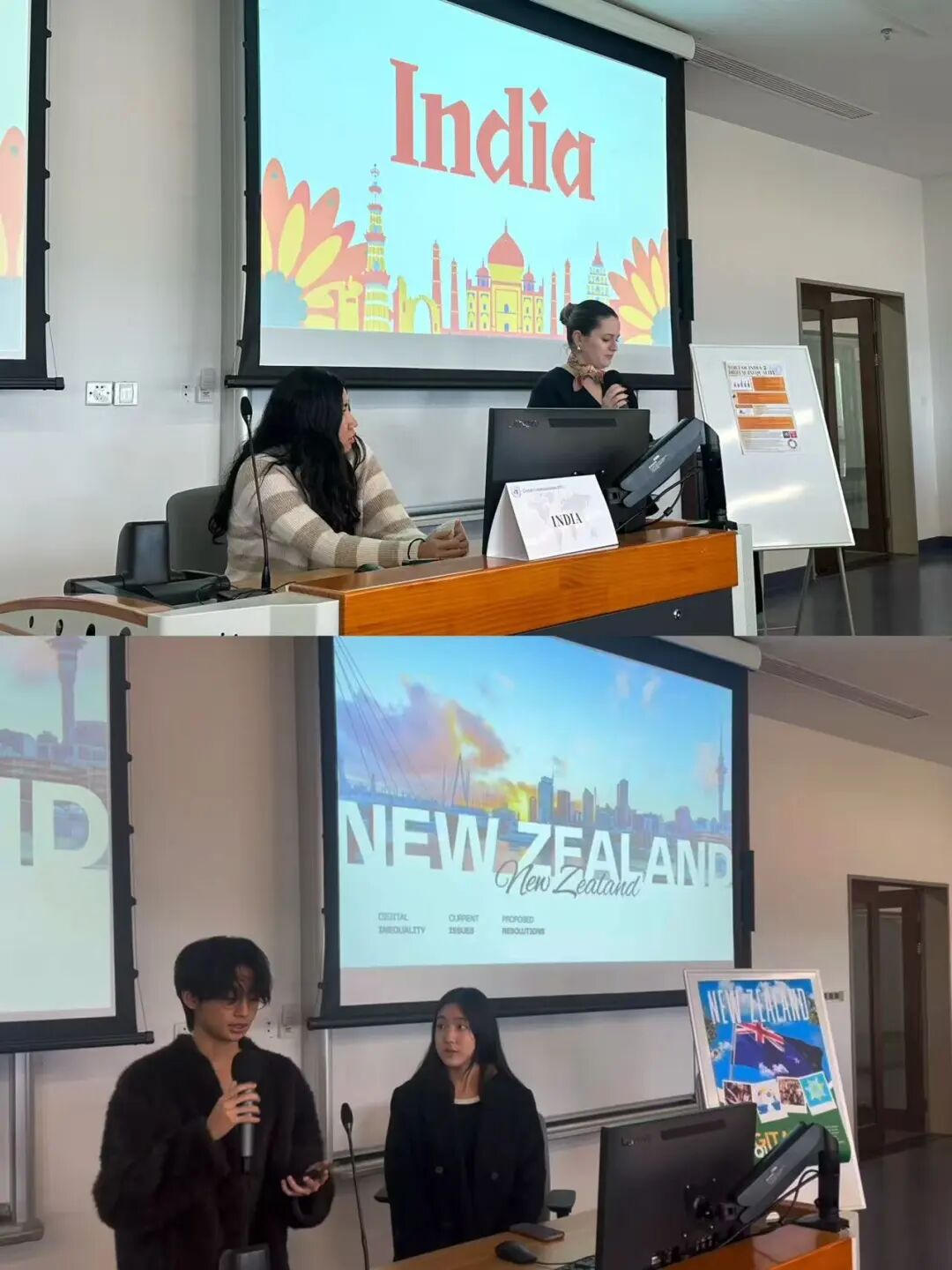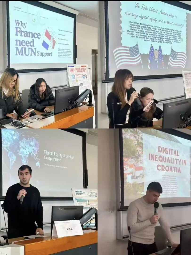 近日,学院和国际联合商学院(ZIBS)、浙江大学国际传播研究中心 共同开设的课程《全球传播》结课。该课程为省级一流本科国际化课程,课程教师赵瑜佩曾以此课程获评浙江省高校教师教学创新大赛特等奖、浙江大学高校创新大赛特等奖。本学期课程以一场聚焦“数字平等”的模拟联合国活动收尾,来自印度尼西亚、泰国、墨西哥、新加坡、越南、克罗地亚、俄罗斯、英国等国的学生组队,深入探讨各国在数字包容、基础设施、技能赋能与治理合作等方面面临的挑战与可行路径。